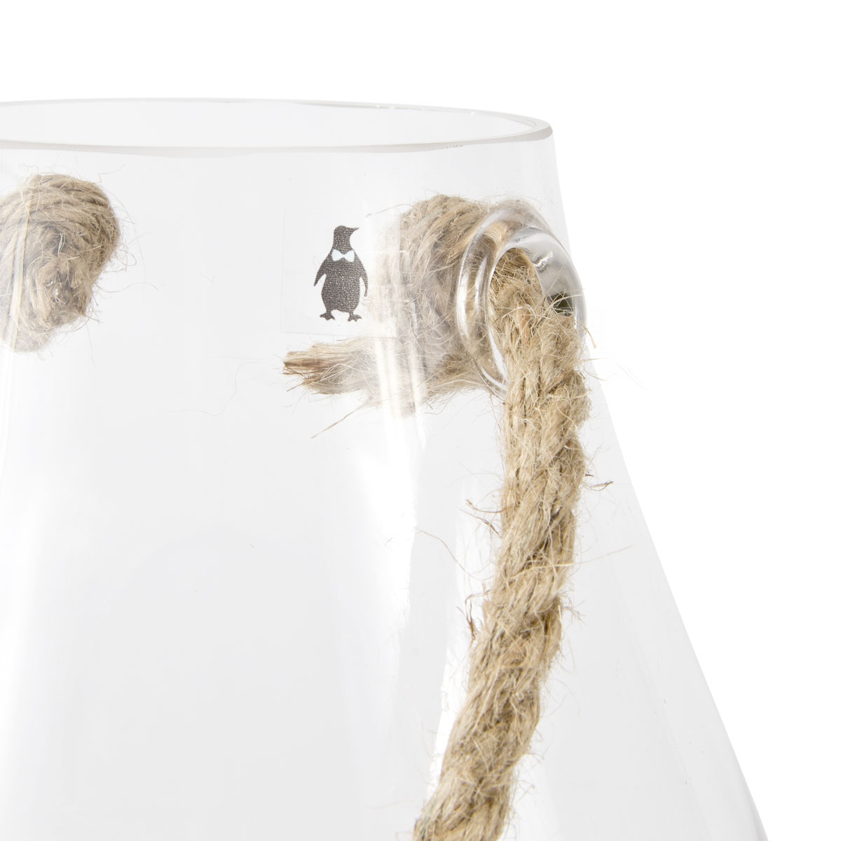Das Laternenglas wird von einem Jutestrick umfasst und kann als Windlicht oder Blumenhalter genutzt werden.